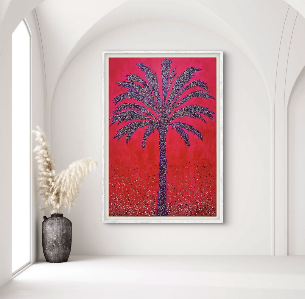 A radiant tribute to sunlight, freedom and vibrant energy. Golden Palm reflects the essence of Mallorca in bold color and shimmering texture. Set against a striking neon red background infused with glitter, the golden palm stretches across the entire canvas, commanding attention with its luminous presence.