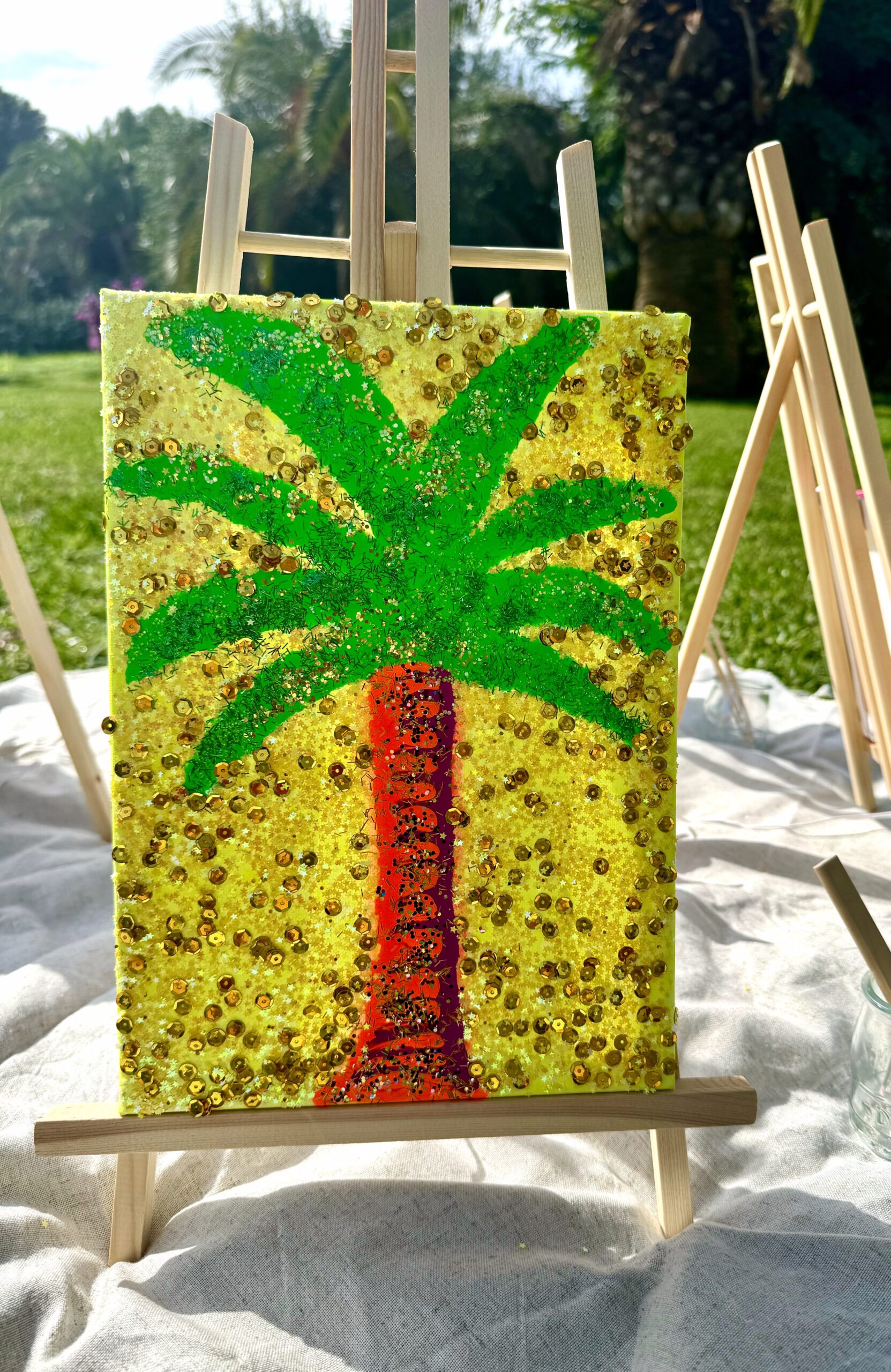 A shimmering tribute to sunshine and serenity. Hand-painted with glimmering gold and neon accents, this palm brings that luxury island feeling to your wall – no matter the weather.