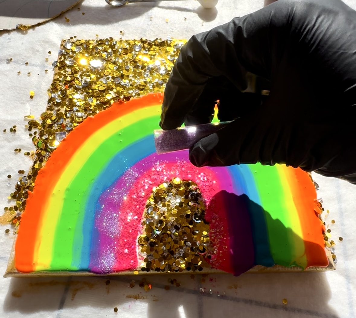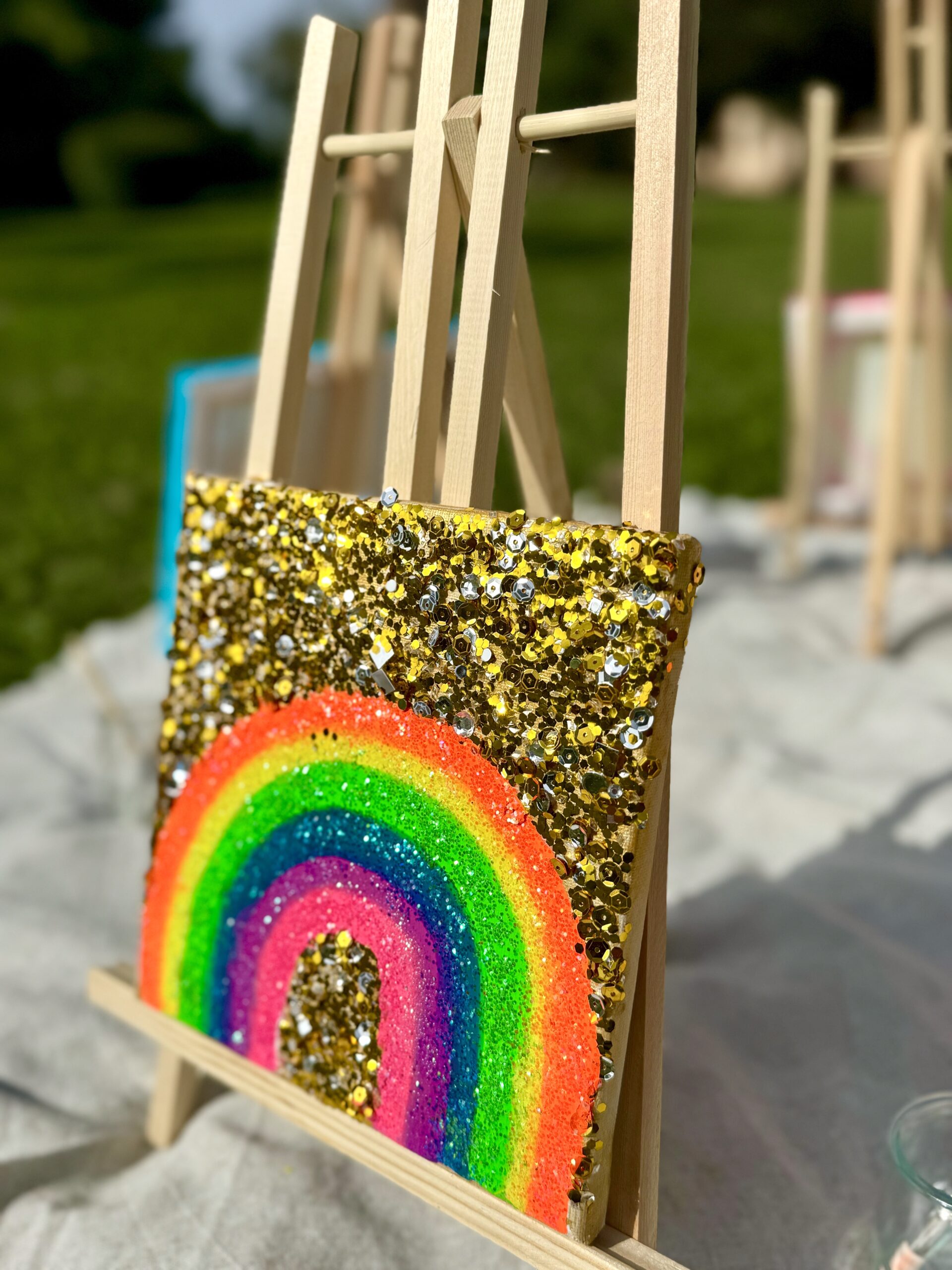 Vibrant, playful, and full of sparkle. This hand-painted rainbow is a feel-good statement for color lovers. Drenched in neon tones and glitter – a mini dose of happiness.