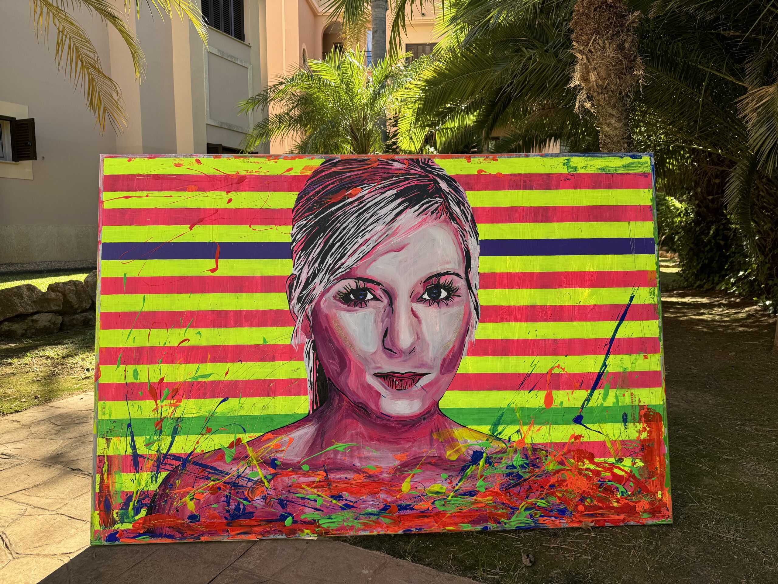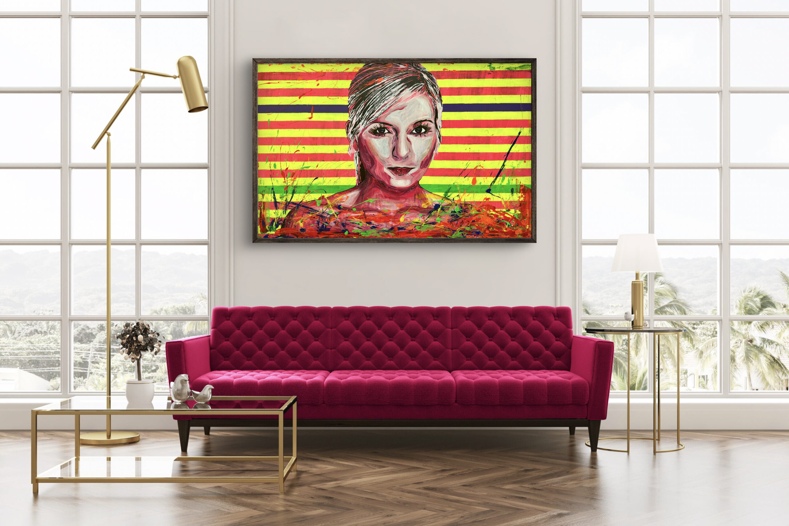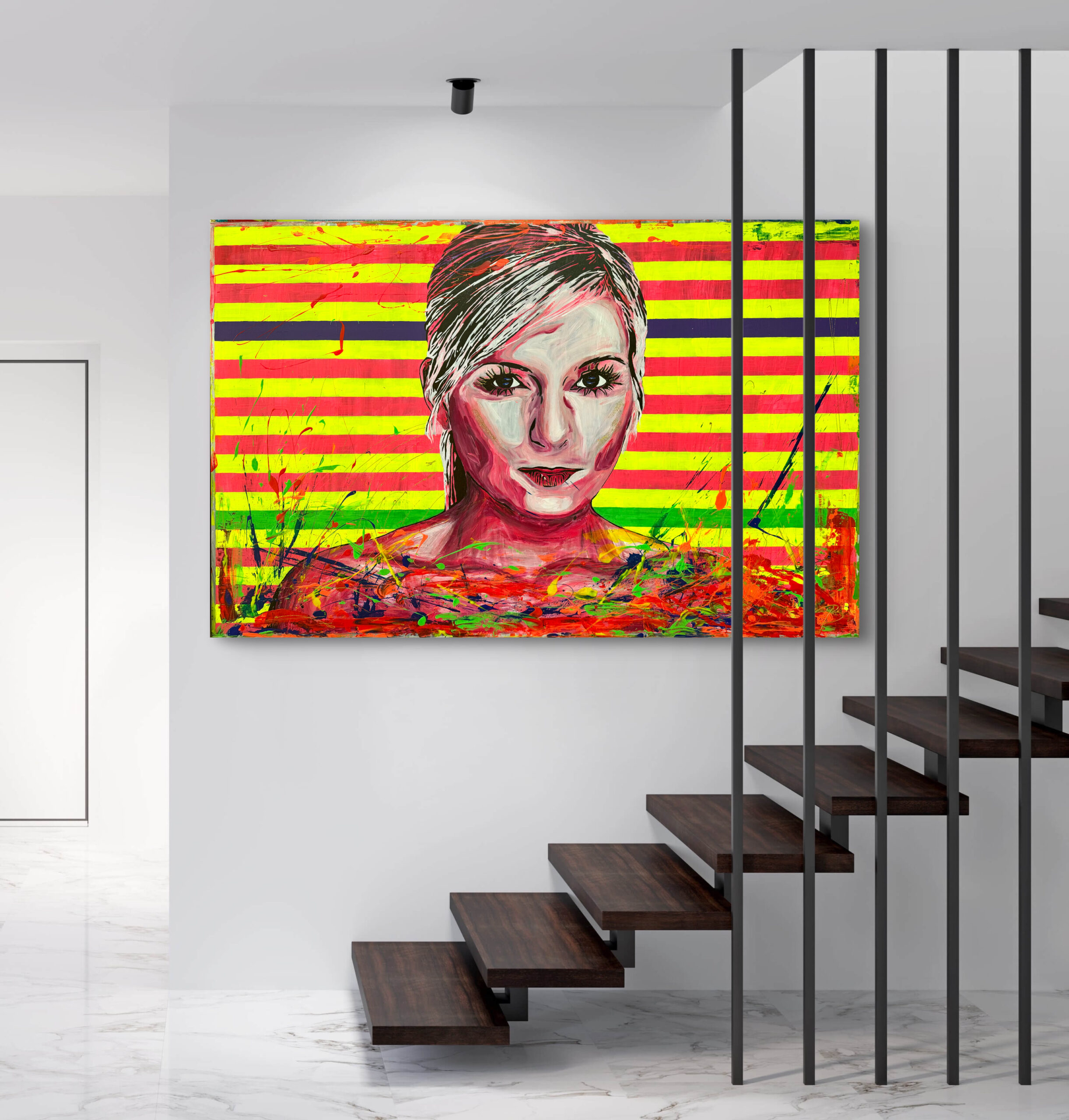 This painting juxtaposes calmness and restraint with vibrant chaos, symbolizing the balance between composure and bold self-expression. The woman’s neutral expression, paired with the simple gray-pink tones, suggests introspection or a quiet confidence. Meanwhile, the vivid neon background and the exuberant, swirling foreground embody a call to action or a celebration of stepping beyond boundaries. The title, „Time to Be Bold“, invites viewers to embrace courage, energy, and individuality, urging them to move past restraint and fully express their inner vibrancy.